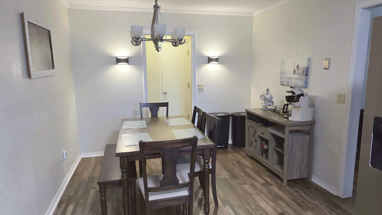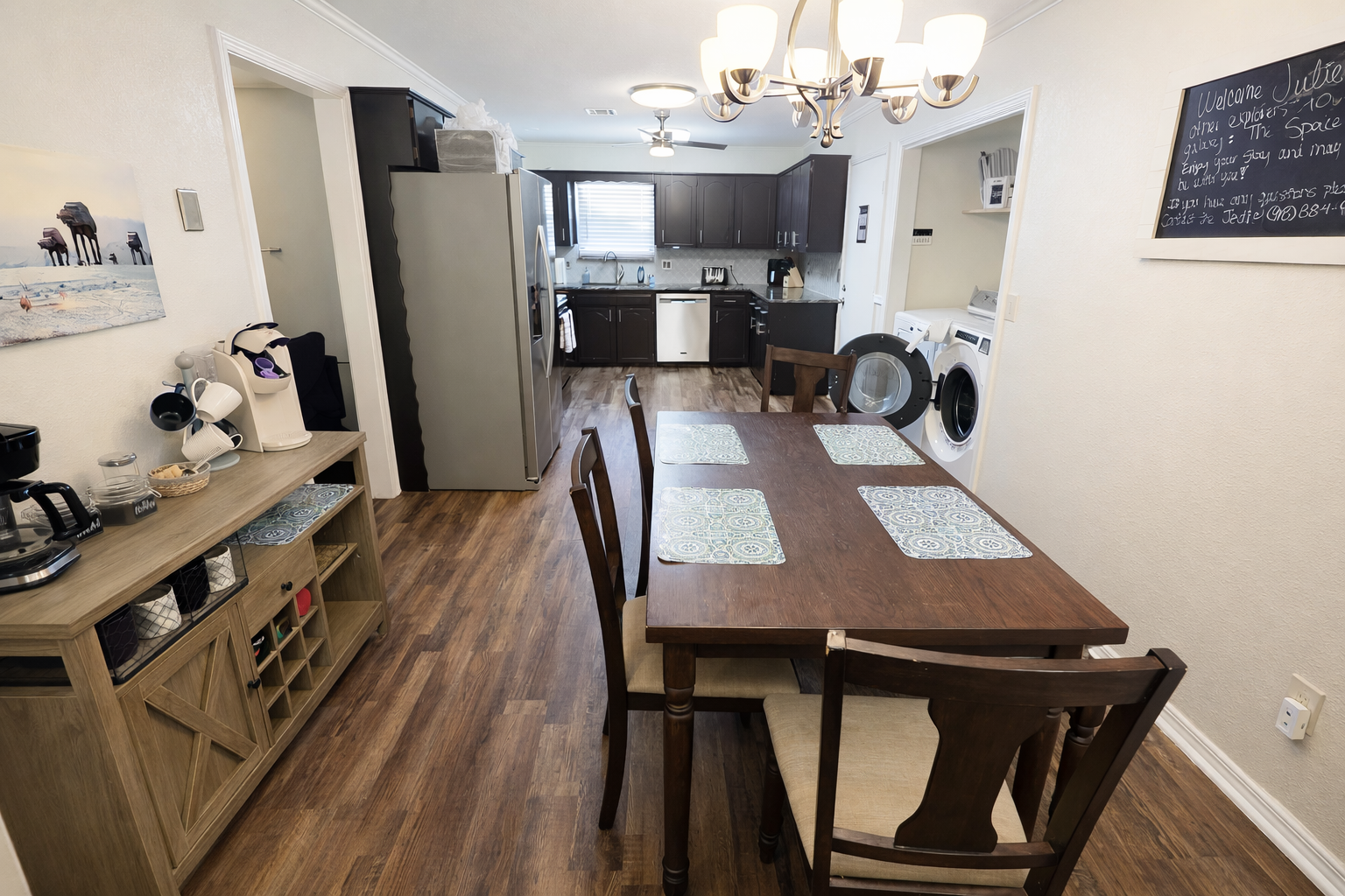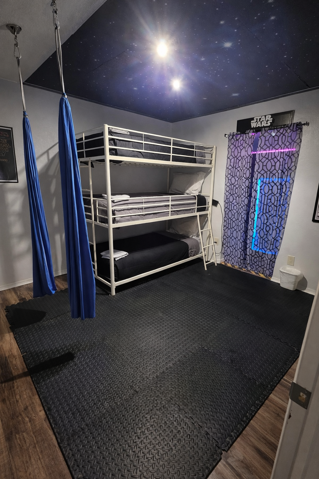 Whether you're craving rest or thrill, our unique, space-themed home is your perfect launchpad for an unforgettable adventure in Tulsa. Perfect for families, friend groups, and even your furry companions, this spacious retreat accommodates up to 9 stargazers. Inside, the galaxy comes to life with glowing decor and endless entertainment. Challenge your crew to a game of ping-pong or foosball in the game room, stage an epic Nerf battle, or unwind with your favorite movie in the cozy, themed movie room. For ultimate relaxation, soak in the jetted tub. The home is also equipped with fast Wi-Fi and a laptop-friendly workspace. Home Details: 2,110 Sq Ft | 3 Bedrooms | 2 Bathrooms Space-Themed Bedroom & Movie Room WFH Friendly Sleeping Arrangements: Bedroom 1: King Bed Bedroom 2: Queen Bed Bedroom 3: Triple Twin Bunk Bed Living Room: Sofa Additional sofas in garage and sun room. Two inflatable mattresses available upon request. Additional: Pack ‘n Play available Amenities: Entertainment: Smart TVs, gaming console, ping-pong table, foosball table, Nerf guns, board games, card games, giant box of Legos Comfort: Central heating & A/C, jetted bathtub, linens/towels, ceiling fans Convenience: Free WiFi, washer/dryer, keyless entry, iron/board, hair dryer, complimentary toiletries Family-Friendly: Pack ‘n Play, high chair, and other baby/toddler amenities, dog pen Kitchen: Fully equipped with refrigerator, stove, dishwasher, microwave, coffee maker, Crockpots, toaster, blender, cooking basics, dishware/flatware Outdoors: Private fenced yard, fire pit, outdoor dining area, furnished sunroom