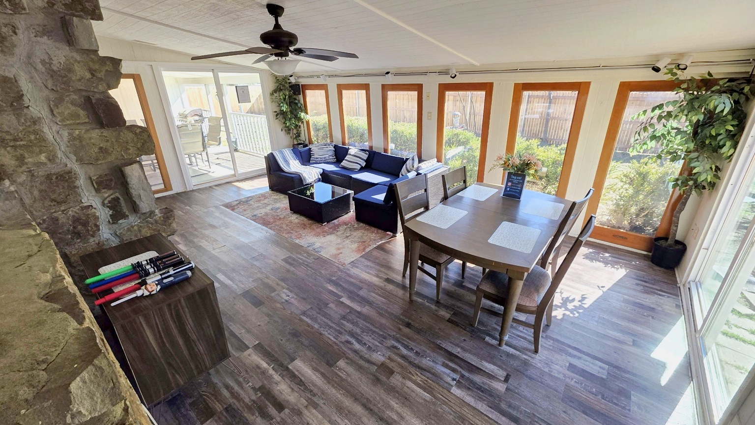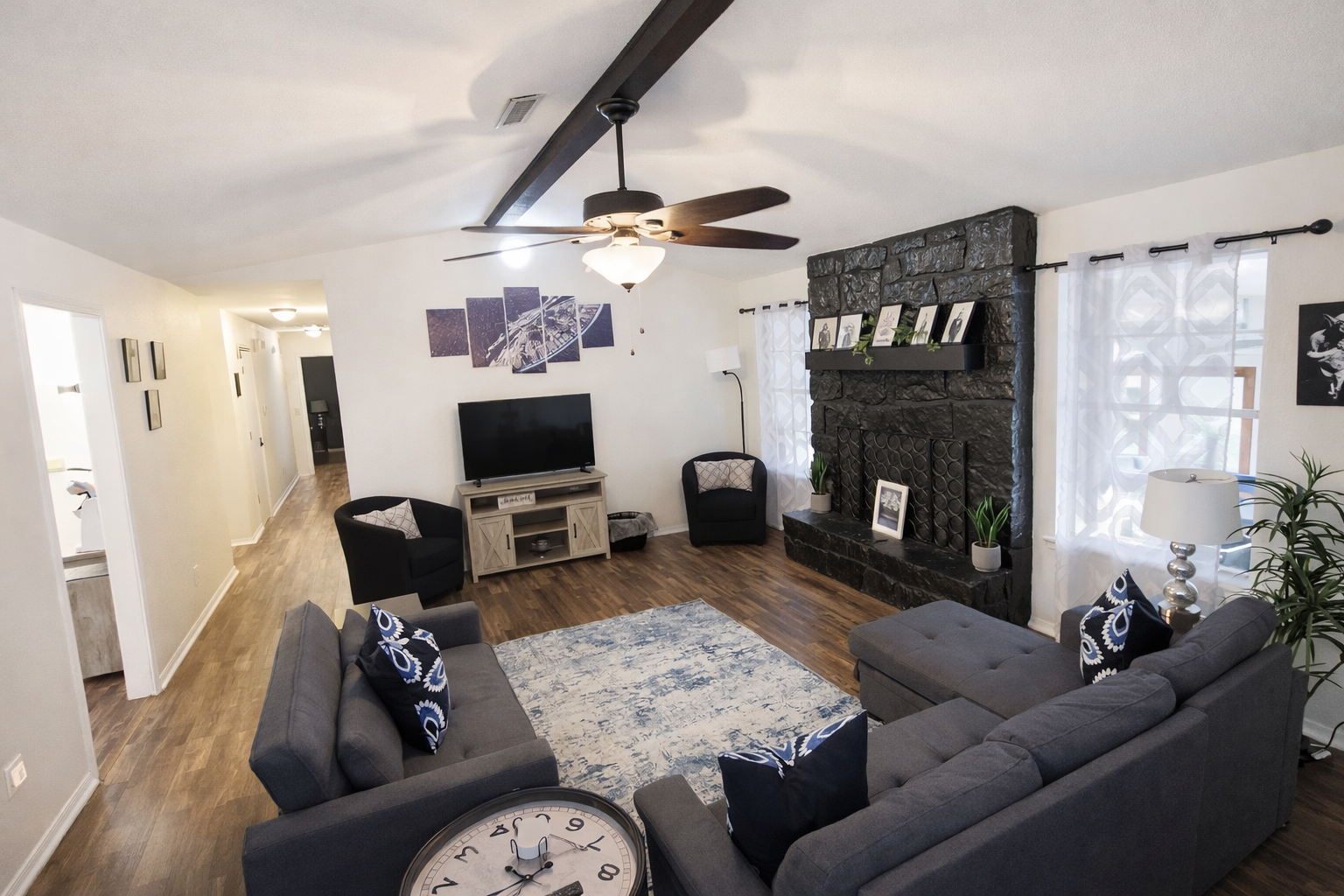 Security: For your safety and the security of the property, there are 4 exterior security cameras facing outward and a Ring Doorbell at the front entrance. These devices record video and audio when motion is detected. An indoor noise monitoring device is also present; it measures decibel levels to ensure compliance with noise policies but does not record conversations. Accessibility: The home features step-free entry. However, please be aware that there are interior steps required to access Bedroom 3 and the sunroom. Fireplace & Fire Pit: The indoor fireplace is decorative and not available for guest use. You are welcome to use the outdoor fire pit in the backyard.